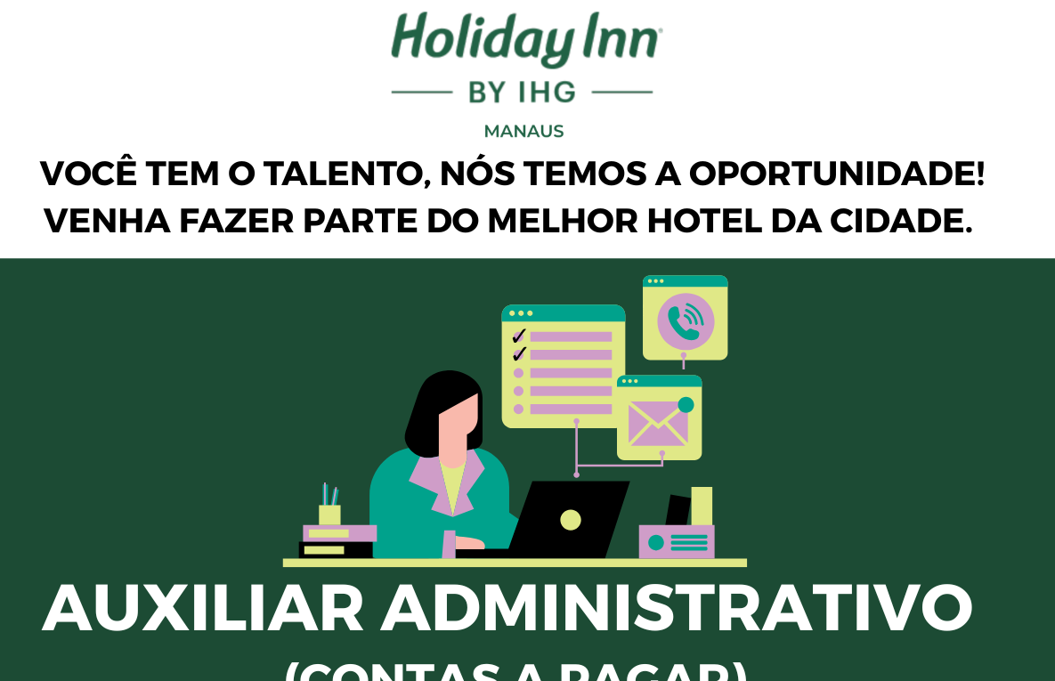 O Holiday Inn Manaus by IHG, um dos principais hotéis da cidade, está com oportunidade aberta para Auxiliar Administrativo –